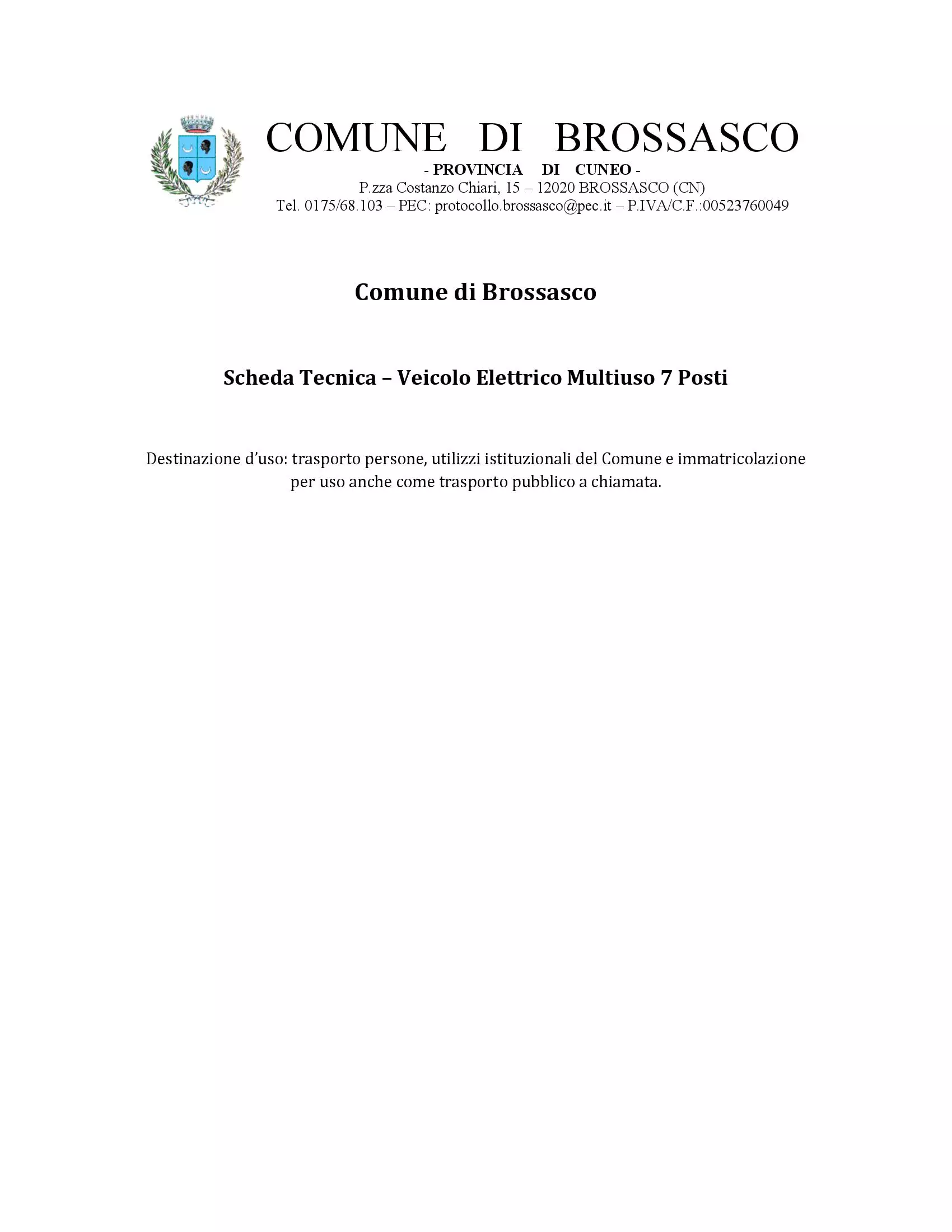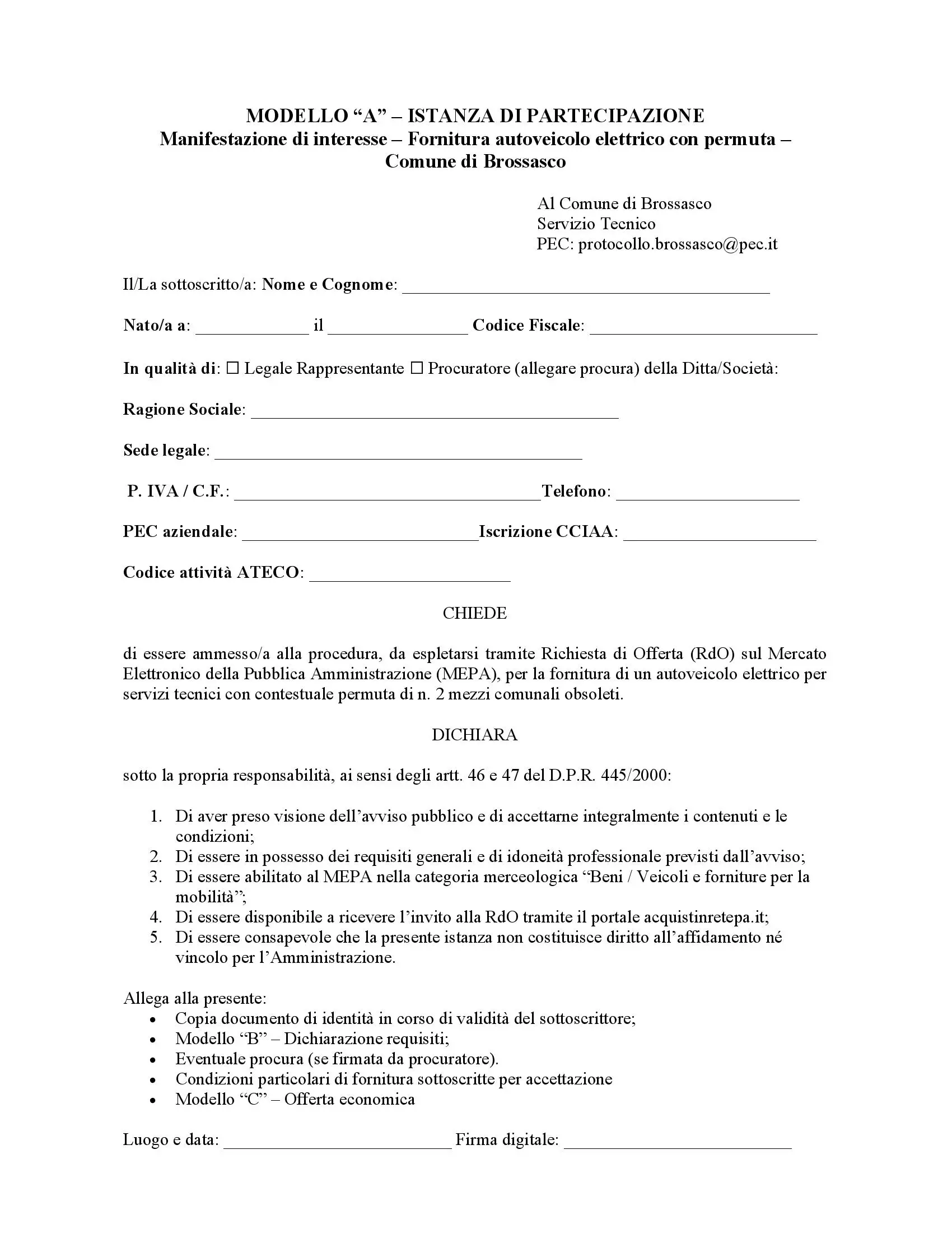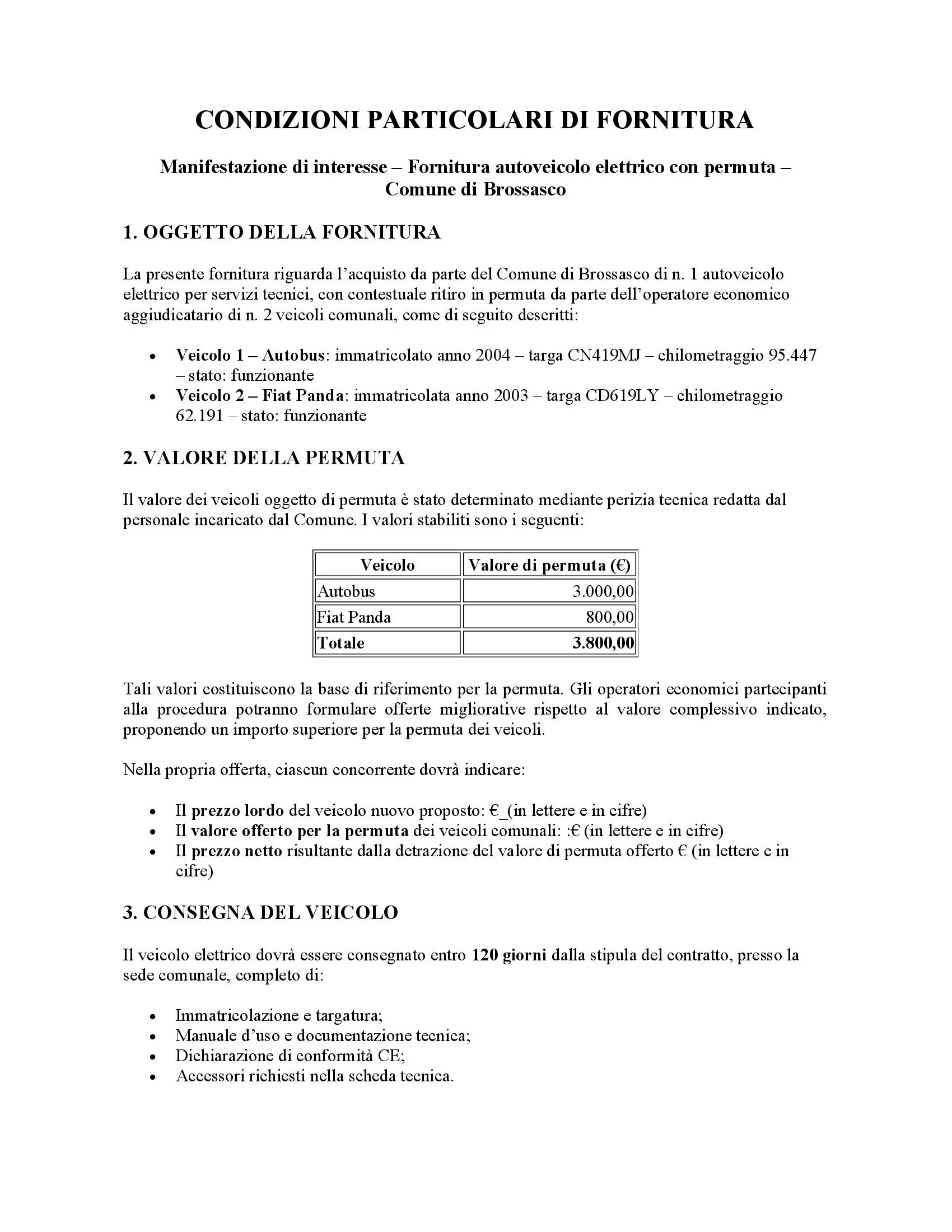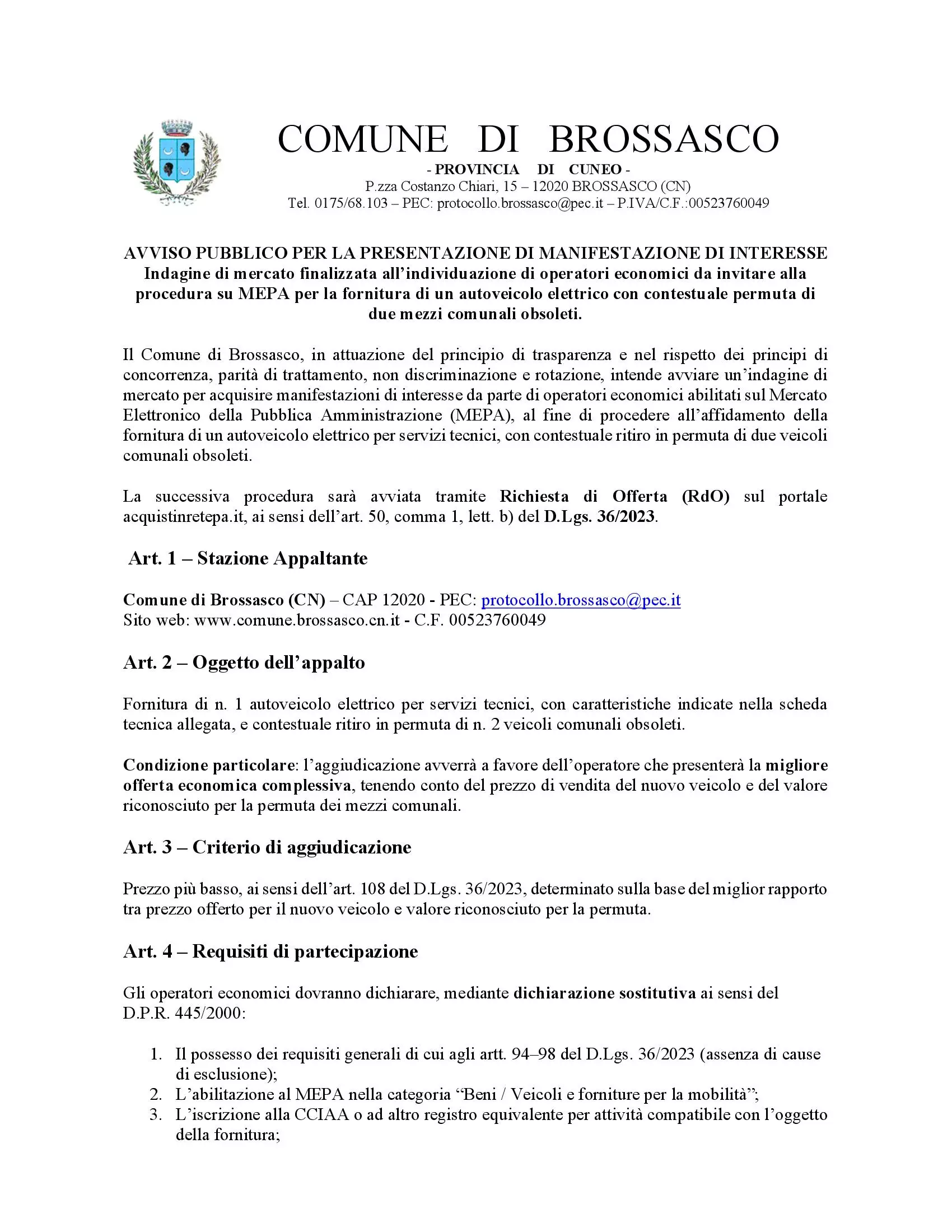 Descrizione MANIFESTAZIONE DI INTERESSE Indagine di mercato finalizzata all’individuazione di operatori economici da invitare alla procedura su MEPA per la fornitura di un autoveicolo elettrico con contestuale permuta di due mezzi comunali obsoleti.