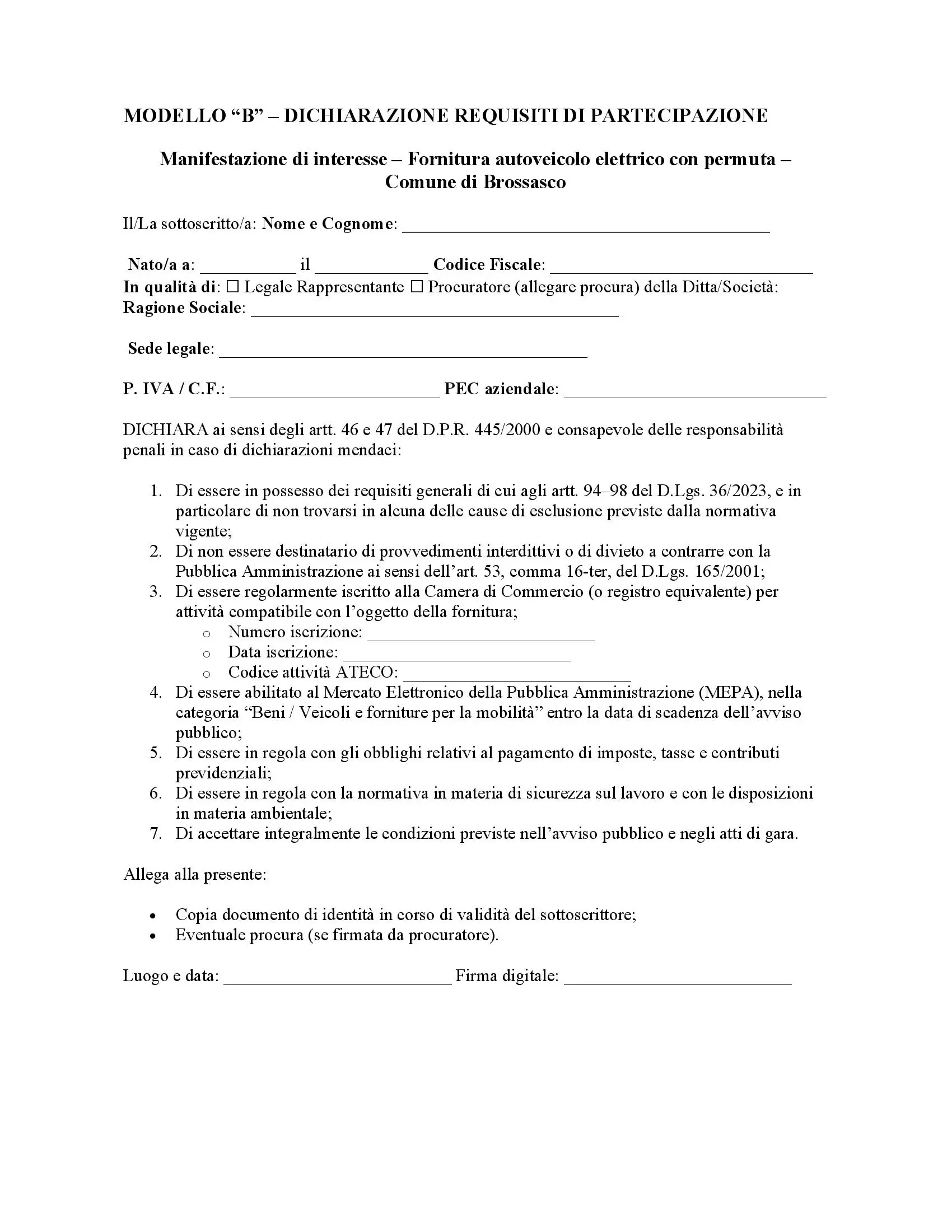Descrizione MANIFESTAZIONE DI INTERESSE Indagine di mercato finalizzata all’individuazione di operatori economici da invitare alla procedura su MEPA per la fornitura di un autoveicolo elettrico con contestuale permuta di due mezzi comunali obsoleti.