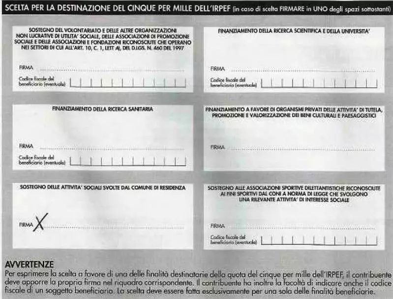 La scelta va espressa sul Modello 730-1 apponendo la propria firma solo nel riquadro corrispondente alle finalità cui si intende destinare la quota del cinque per mille dell’Irpef.