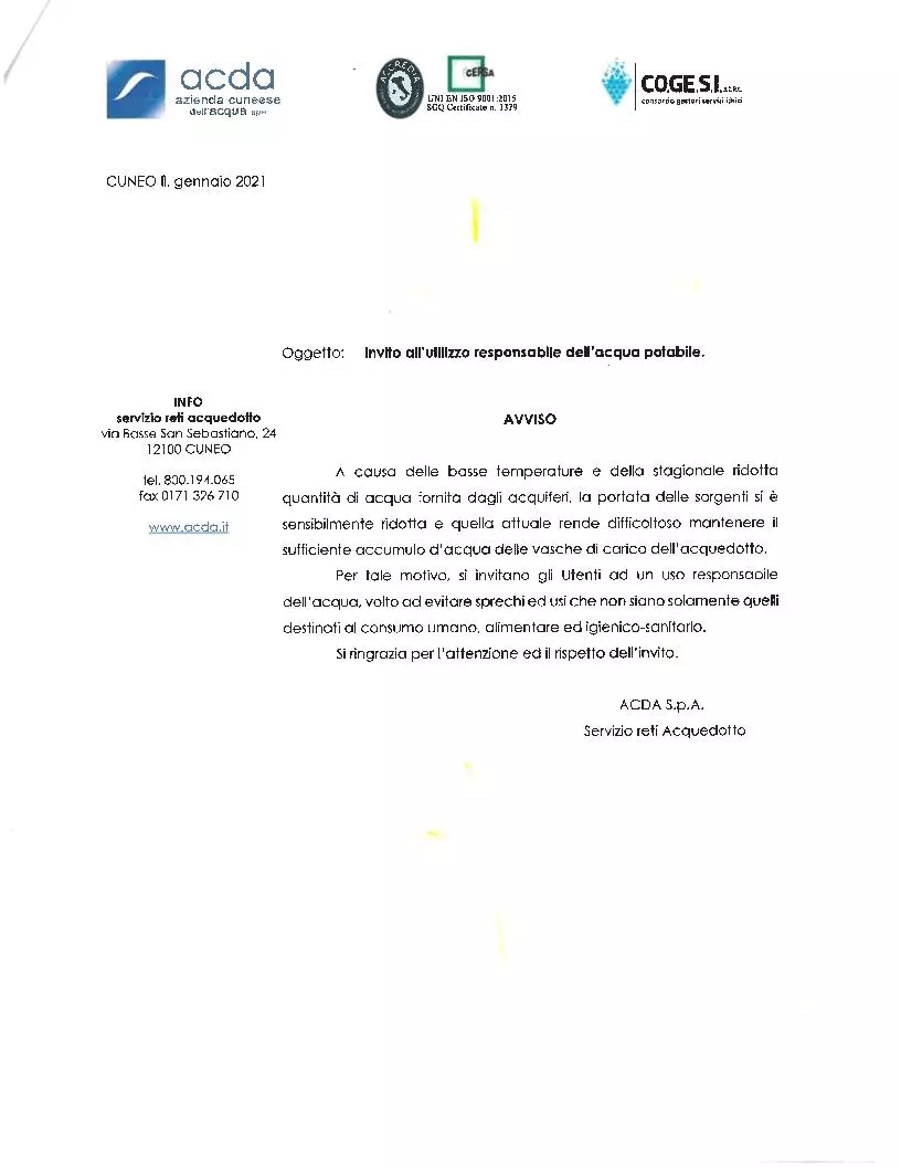 Documenti Formati disponibili: .pdf AVVISO PER UTILIZZO RESPONSABILE DELL'ACQUA Ultima modifica il 02/01/2024 15:05